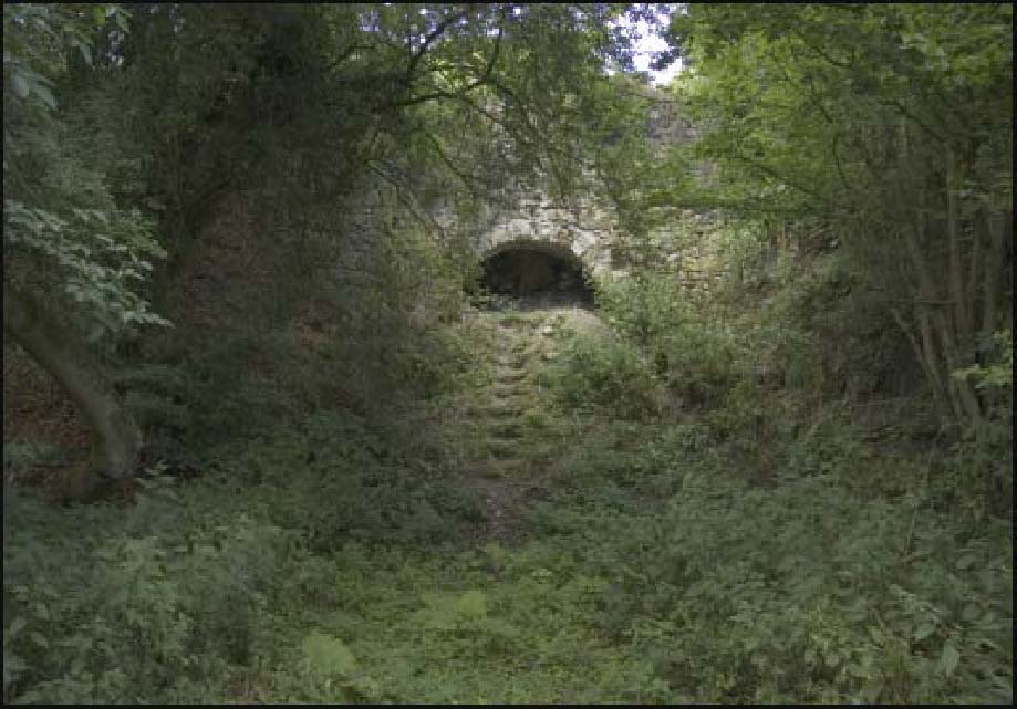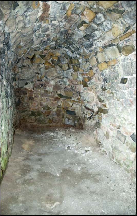 The two substantial lime kilns are constructed into the south slope of the hill. The western kiln has a central cone, in-filled and today recognisable only by a shallow dished hollow 8m in diameter and 0.5m deep This is flanked by two large barrel vaulted discharge vaults of stone construction in an excellent state of preservation, visible below the cone hollow (plate 6).