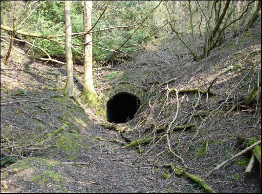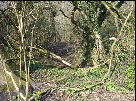 At the southern end of the incline is a flattened area between the end of the incline and the two kilns which lie at SO59667350 and SO59677350. This would have been the work area above the charge cones. To the west, centred at SO59617351 is an extensive area of spoil tipping which is probably waste material from the construction of the drift mine. It seems clear that considerable effort was made to construct this mine and from the amount of spoil that is present today, that it is likely to extend for some considerable distance into the hill. There is a second much smaller arched structure at SO59657354 which may also be a drift mine entrance.
