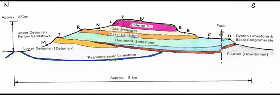 The Carboniferous sequence is remarkable here in having representative strata from the Lower, Middle and Upper Carboniferous Period [Oreton Limestone, Combrook Sandstone formation and Coal Measures, respectively] all lying within about 1.5 km of The Novers site. In addition there is a spectacular sill of igneous rock intruded into the Coal measures. This olivine dolerite is known locally as the Dhustone (from the Welsh 'black' stone). The sill forms a capping to the Clee and Titterstone Clee Hills.